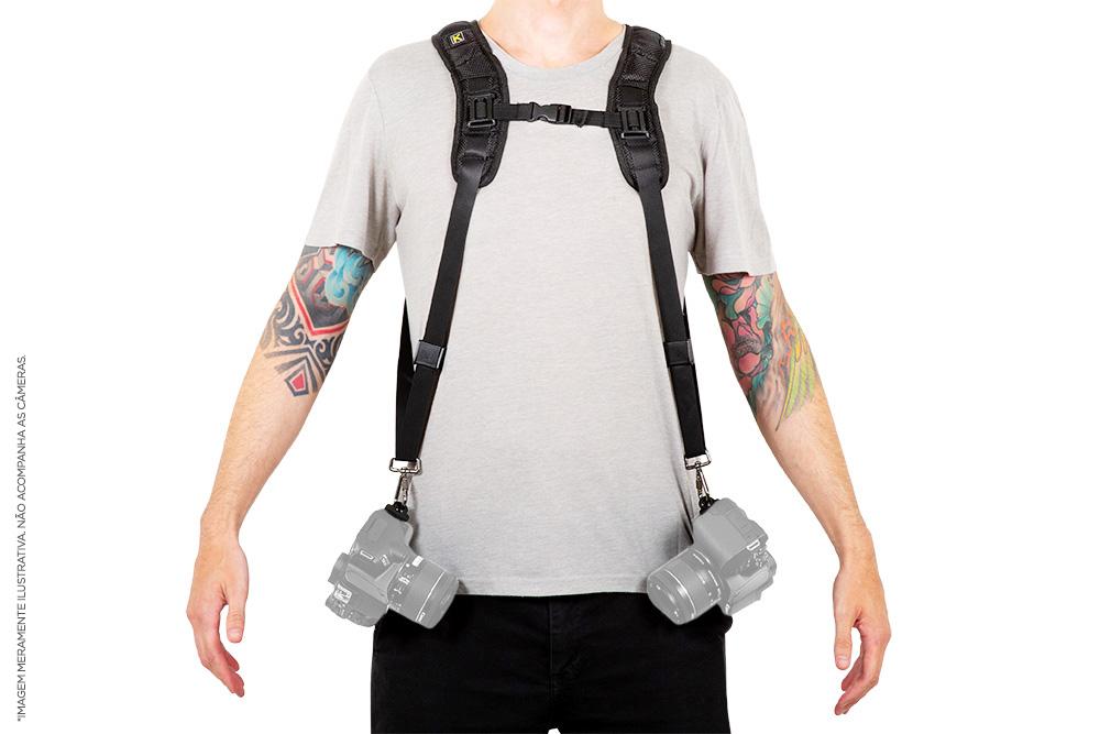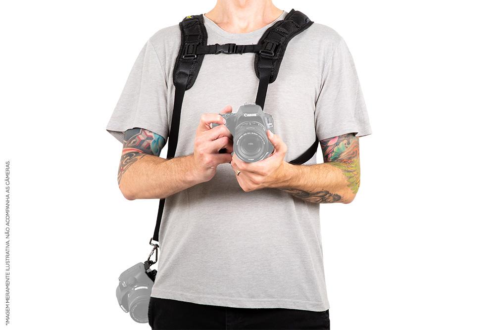 - Descrição: Alça Dupla com Engates de Segurança para Câmera DSLR Greika - Alça D - Código: Alça D - Material: Nylon - Cor: Preta - Tamanho ajustável - Peso: 300g
