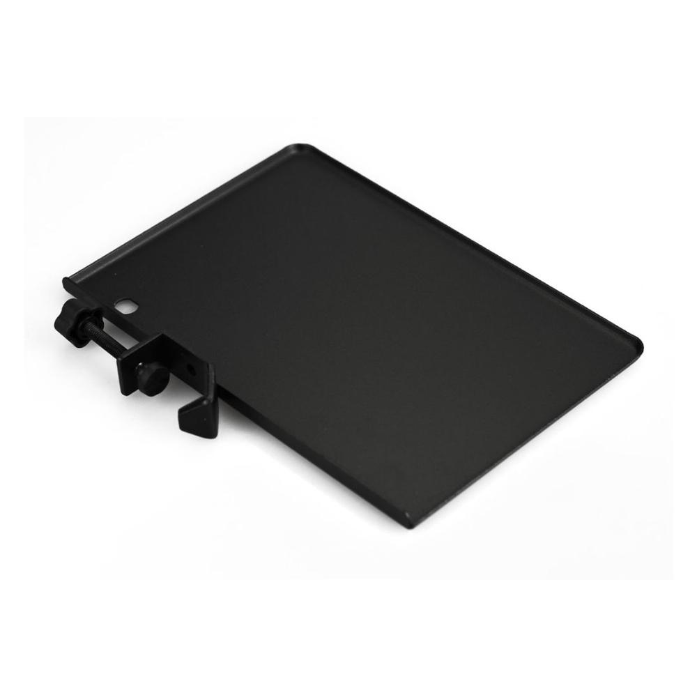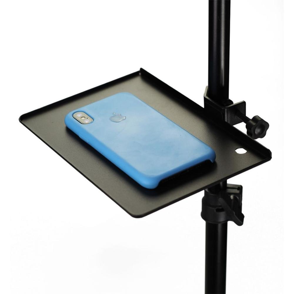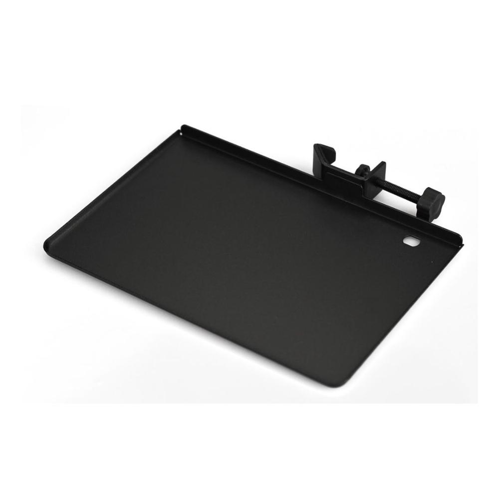 A bandeja tem 20 centímetros de comprimento e 14 centímetros de largura, com bordas levemente elevadas para garantir que seu acessório não caia do suporte. Possui um clamp braçadeira acoplado que é compatível com superfícies, cilíndricas ou retas, de até 3cm.